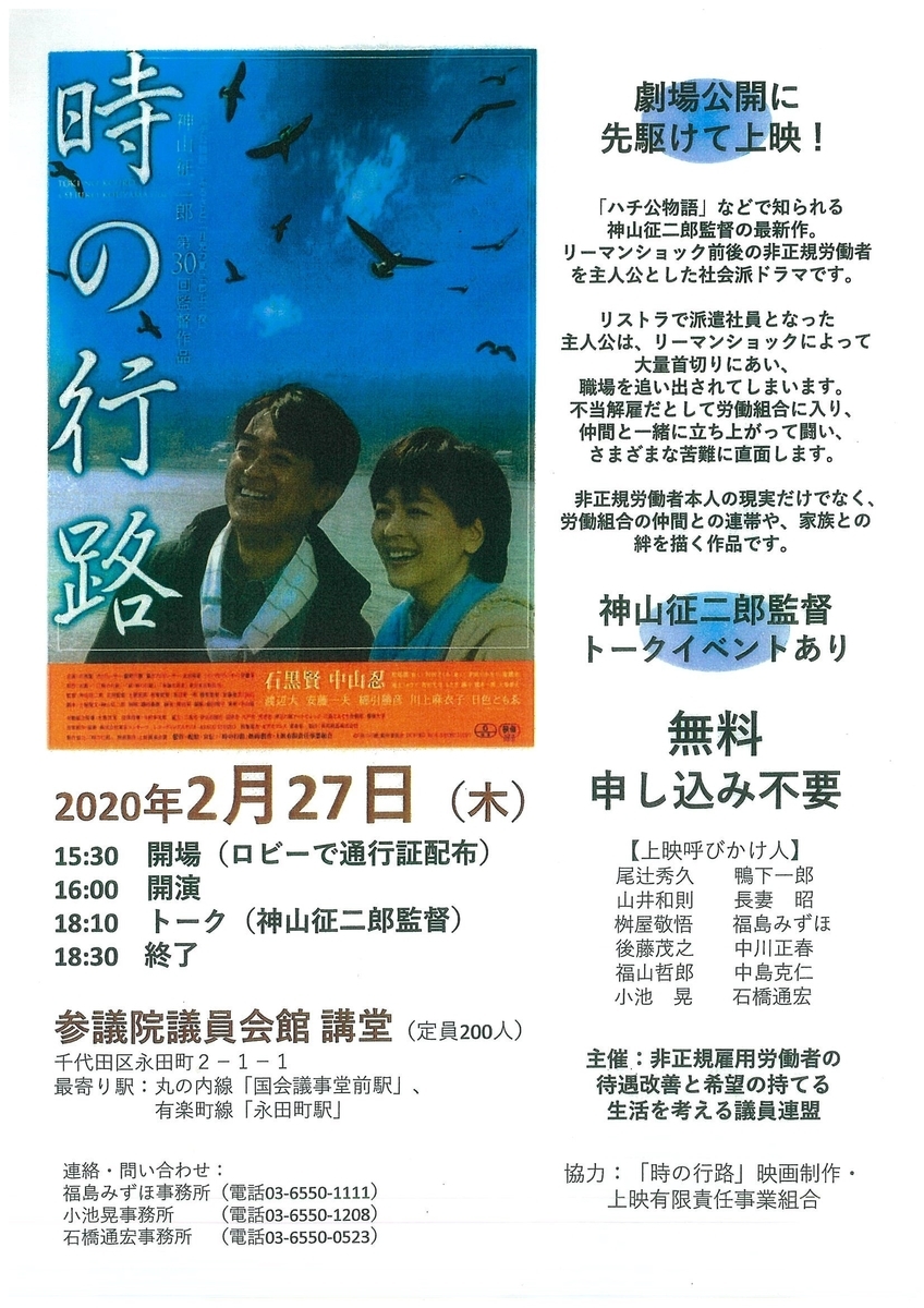 派遣切りとたたかった労働者の実話を描いた映画「時の行路」。リーマンショック前後の非正規労働者を主人公とした社会派ドラマ「時の行路」が映画化され、劇場公開に先駆けて3月27日(木)、16時~参議院議員会館で上映されます。神山征二郎監督、主演 石黒賢。ポスターを開く「時の行路」上映 参議院議員会館(2020年2月16日up)